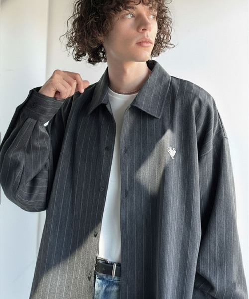 「日常をアップデート。」刺繍入りウールライクストライプ柄オーバーサイズシャツ(長袖)/Wool-Feel Fabric Embroidered Stripe Pattern Oversized Shirt