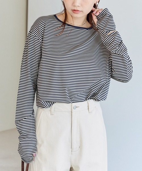 ■デザイン細めのボーダー柄とフィンガーホールがポイントのプルオーバー。やや広めの襟ぐりでネックラインをきれいに見せ、抜け感をプラスします。袖口は親指を通せるフィンガーホール仕様で、袖をくしゅっとさせても可愛く着られるデザインです。■素材肌触りの良い、柔らかく伸縮性のある素材。程よい厚みでロングシーズン着用可能。シワになりにくく、お手入れも簡単なのが魅力です。■コーディネートデニムと合わせたカジュアルスタイルはもちろん、スカートと合わせて女性らしい着こなしも◎インナーとしてジャケットやアウターに合わせても、程よい存在感を演出できます。着回し力の高いデザインで、一枚持っていると着こなしの幅が広がるアイテムです。・サムホール・お手入れ方法:洗濯機可・マルチサイズ/大きいサイズ対応(M/LL/3L/4L/5L)---------------------------------------透け感:なし裏地:なし伸縮性:あり生地の厚さ:やや薄手---------------------------------------【お買いものをよりお楽しみいただく為に♪】▼商品のお気に入り登録(ハートマークをクリック)お気に入りアイテムの再入荷やセールの通知も受け取ることができます。▼ブランドのお気に入り登録新商品やクーポン配布などのお得な情報を受け取ることができます。■商品注意事項■※商品画像は、光の当たり具合やパソコンなどの閲覧環境により、実際の色味と異なって見える場合がございます。予めご了承ください。※末永く愛用頂く為に、アテンションタグ・洗濯ネームを必ずご確認の上、着用又はお取り扱い下さい。※生産時期により色味が多少異なる場合がございます。予めご了承ください。