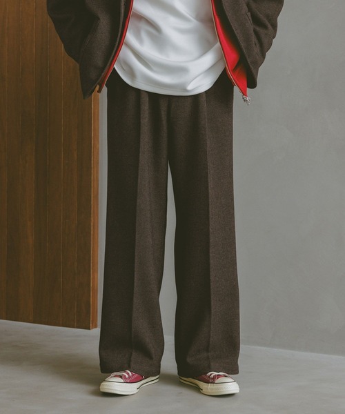 スタイリングを上品にまとめるワイドスラックス ーーー ■ポイント セットアップでも着用いただける、上品な質感のスラックスが登場。 少しワイドな腿周りから裾にかけてテーパードがかかるシルエットなので、動きやすさに加えて、すっきり見えを実現。 ウエスト後部にはゴムを入れることで、様々なご体型の方でも着用頂けます。 フロントには2タックデザインを採用し、腰回りをすっきりとした印象に仕上げました。 ■素材 太くて粗い糸を使用したツイードライク生地は、厚手で丈夫な仕上がりです。 本来だとチクチクしやすいツイード生地ですが、ポリエステルを混紡した素材を使用することで、柔らかく肌触りが良くなっています。 程よくウールをブレンドすることで、保温性が高く、長いシーズン着用頂けます。 ====== ■参考サイズ S:~165cm M:~175cm L:175cm~ ====== ーーー ■スタイリング 暖かみがあり上品な雰囲気のツイードライクスラックスは、ニットやシャツと合わせたコーディネートがおすすめ。 アーガイル柄のニットと合わせて頂くと、より季節感のあるお洒落なスタイルが完成します。 柔らかな印象を与えるニットスタイルとは反対に、爽やかな印象に変わるシャツスタイルもRAGEBLUEイチオシです。 同素材のジャケットとセットアップで合わせて頂くと、オフィスシーンでも大活躍します。