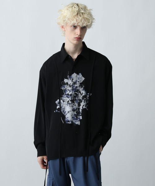 ーーー フロントの墨で描いたようなフラワーモチーフが存在感抜群 コードを垂らしてアクセントを効かせたデザインシャツ ーーー DESIGN フロントに大振りのフラワーモチーフをプリントしており、まるで墨で描いたようなタッチが個性をプラス。 モノトーンカラーでプリントする事で派手過ぎず取り入れやすい一枚。 裾にはコードを垂らして動きのある個性的なデザインに。 ゆとりのある身幅で、落ち感があるためラフにザックリと着用できます。 MATERIAL ポリエステル100%を使用しており、滑らかで綺麗な表面感が特徴。程よい光沢感があり上品な印象に。 シワになりづらいためお手入れも簡単〇