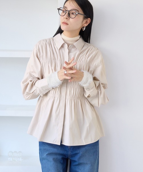 VISのベストセラーシャツからクレリックが新登場! 細見えが叶うシャーリングデザインシャツ◆2025秋冬◆ <POINT> ・シャツを土台にビスチェ風のシャーリングを施した人気シリーズのデザインシャツです ・ラインを拾わずに体に沿いながら細見せシルエットを叶えてくれます ・ストライプ素材は今年一番取り入れやすいトレンドキーワード! 【デザイン・シルエット】 肩部分はシャーリングの入っていないヨークデザインにしているので、着用時にも安定し着心地がよいデザインに計算しています。 後見頃にもシャーリングデザインを施し、ウエストマークされて全体的に細見えするようにデザインされています。 前立て部分は開けて着用も出来るようにすべて前立ては飾りボタンに。 袖口周りはシャツのシャープさと女性らしいシルエットが共存するように深くタックを入れ、袖口に膨らみのあるフォルムにしています。 【素材】 生地はシャーリングと相性が良いように、固すぎず、柔らかすぎないコシのあるシャツ生地です。 ※カラーによって組成・混率が異なります。 ブルー系(45):ポリエステル 100% その他のカラー:ポリエステル 65% 綿 35% 【カラー】 クレリックデザインにはライトブルーストライプ、 その他の色は衿もすべて同じ生地の展開で、シャープに着こなせるネイビーと柔らかく女性らしさを演出してくれるベージュとピンクの4色展開。 【おすすめのスタイリング】 一枚でも、羽織としても着用できるようにしています。 とくにパンツとの相性が良いです◎。 【モデル着用サイズ】 28(ベージュ系)、41(ネイビー系)モデル身長:168cm 着用サイズ:F 45(ブルー系)、65(ピンク系)モデル身長:161cm 着用サイズ:F ※画像の商品はサンプルです。 実際の商品と仕様、加工、サイズが若干異なる場合がございます。 ※画像によっては実際の色味と異なる場合があります。正しい色味は生地アップ画像をご確認ください。