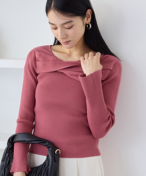 胸元のツイストデザインが特徴的な華やかリブニット◆2025秋冬◆<POINT>・程よく体にフィットするのでシルエットもきれいに着まる・やわらかいモチモチ素材・首元のツイストデザインでスタイリングがワンランクアップ【デザイン・シルエット】モチっとした素材で程よくフィット。リブ編みなのでボトムにインしやすいデザインです。ネックの華やかさでコートを着る時期にもポイントに!袖口は広がりすぎないフレアライン。フレア部分は短めに設定しているので袖をたくし上げることもできます。【素材】モチモチ感が着心地の良いリブ編みニット。【カラー】ベーシックなブラック、キナリ系、柔らかなサックスとローズピンクの4色展開です。【おすすめのスタイリング】ボトムにインするスタイルにおすすめのニット。インするとキレイ目な印象になるのでマーメイドSKやハイウエストパンツは好相性。丈は長すぎないのでアウトでかじゃゆあるに着こなしても◎-----------------------------裏地:なし光沢感:なし透け感:キナナリ(17)のみややあり、その他なし伸縮性:ややありポケット:なしボタン:なし生地の厚さ:普通季節:春、秋、冬-----------------------------【モデル着用サイズ】モデル身長:168cm 着用サイズ:F※画像の商品はサンプルです。 実際の商品と仕様、加工、サイズが若干異なる場合がございます。※画像によっては実際の色味と異なる場合があります。正しい色味は生地アップ画像をご確認ください。
