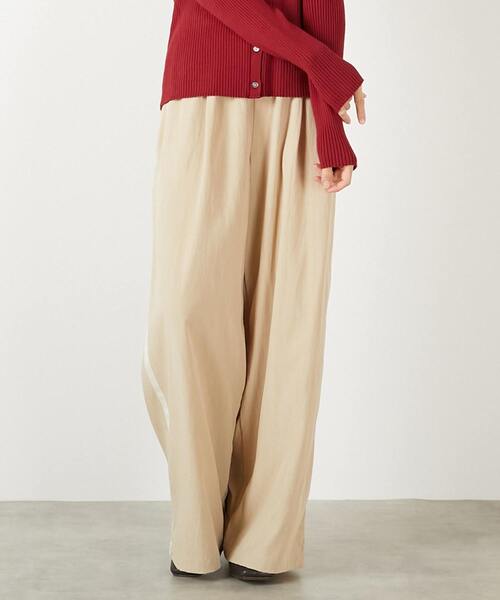 レーヨン×ナイロンのドライタッチでしなやかな素材で作ったトラックパンツ。 さりげない配色のライン使いで、気軽にトレンドを取り入れやすいおすすめの1枚です。 ゆったりしたシルエットでリラックス感があり、 Tシャツ合わせでもこなれた雰囲気に仕上がるのもうれしいポイント◎ 両サイドにポケットあり。ウエストはフルゴム+共地のリボンでサイズ調整が可能。 ※画像の商品はサンプルです。実際の商品と色味、仕様、加工、サイズ、素材等が若干異なる場合がございます。