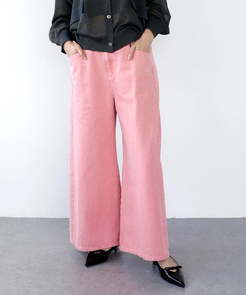 トレンド感のあるくすみピンクなデニムパンツワイドに広がって落ちるラインが美しいシルエットに。カジュアル感を残しつつ、甘さをプラスしてくれるカラーリングが魅力です。ウエストのサイドに付いているボタンを締めてタック入りのシルエットとしても楽しめます。 季節を問わず着用できる万能パンツです。 --------------------------------------透け感:なし裏地:なし伸縮性:なしケア方法:洗濯機可※お洗濯の際は洗濯表示を必ずご確認ください。--------------------------------------