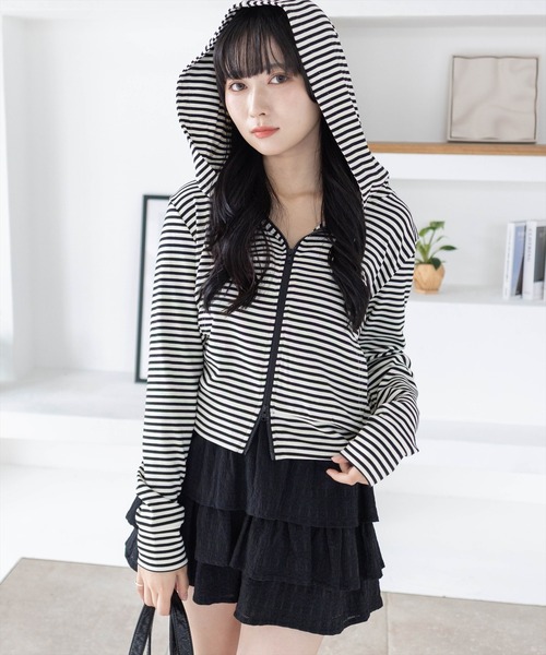 軽やかに羽織れるシンプルアイテム!ボーダー柄ダブルジップパーカー【デザイン】フロントジップ仕様でさっと羽織れるライトなジップパーカー。コンパクトなシルエットで、カジュアルながらもすっきりとした印象に仕上がります。シンプルなデザインで、レイヤードや小物合わせを楽しめるアイテムです。【素材感】着心地の軽いポリエステル素材伸縮性:あり/ 透け感:なし/ 裏地:なし 手洗いによる洗濯可 / ドライ・ウェットクリーニング可【コーディネート】デニムパンツを合わせてラフにまとめれば、自然体でこなれたカジュアルスタイルに仕上がります!ロングスカートやショートパンツと合わせるとストリート感のある雰囲気が演出でき、スニーカーを添えれば抜け感もプラスできます◎【※お取り扱い上のご注意】1:モニター環境等により実際の商品と多少色味が異なって表示される場合がございます。予めご了承下さい。2:屋外で撮影された商品は、天候により多少実際のカラーと異なる場合があります。商品のカラーはトルソー(マネキン)の商品画像をご参照ください。3:濃い色の商品は、お洗濯や摩擦等による移染にご注意ください。4:末永くご愛用頂く為に、アテンションタグ・洗濯ネームを必ずご確認の上、着用又はお取り扱い下さい。5:生産時期により、色、サイズ、デザイン、素材の質感が多少が異なる場合がございます。あらかじめ御了承下さいませ。