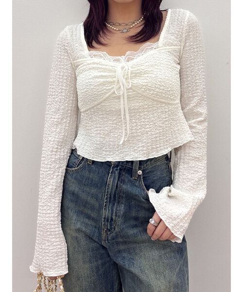 表面感のある素材の天幅にレースをたたきつけたトレンド感のあるトップスです。 バスト部分にはベロアテープをあしらい、立体感のあるデザインで女性らしい印象に。 少し広がるフレアスリーブや、裾・袖口のメローディテールが女性らしさを引き立て、1枚で主役になるトップスです。 デニムでカジュアルダウン、ミニスカートにブーツなどのスタイリングがオススメです。