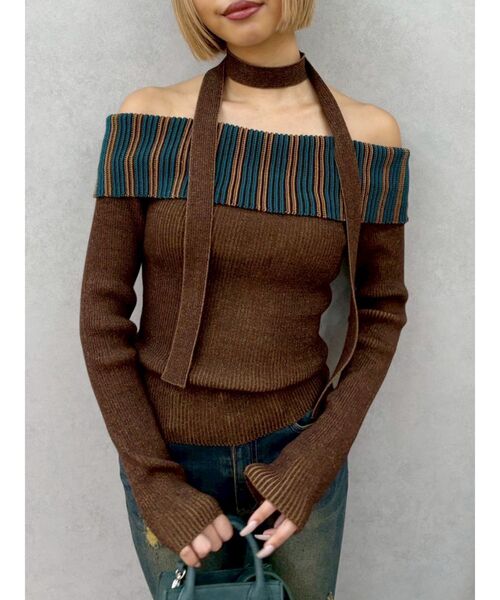 オフショル部分に3種類の糸を使用したプレーティングデザインのオフショルニットトップスです。全体のボディーカラーとオフショル部分のカラーのコントラストがポイントで、シンプルですが一癖あるカラーにEVRIS(エヴリス)らしさを入れました。