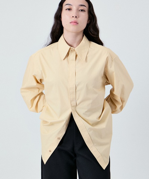 メンズウェアの文脈を感じさせる、ボクシーなオーバーサイズシャツ。 打ち込みの強い高密度なシャツ地を採用し、ミニマルながらも立体的で奥行きのあるシルエットに仕上げました。 襟元にはさりげなくウエスタンシャツのディテールを踏襲しており、無骨さと洗練が同居するさりげないアクセントに。 ゆとりのあるサイジングは、インにニットを重ねてシャツジャケットのようにも着用可能。 ショーツやミニスカートなどと合わせ、レングスのギャップを活かしたレイヤードもおすすめです。 素材のハリ感と、肩の落ちたシルエットが自然な抜けを演出し、力の抜けたモードスタイルを構築します。定番的なアイテムでありながら、ほんの少しの“ズレ”が効いた一枚。日常にこなれたムードを添えるプロダクトです。