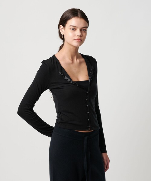 シンプルながらボタンディテールがインパクトのあるアイテム ■デザイン 細身のシルエットでさまざまなスタイルにマッチするカーディガン。 フロントにループ&ボタンをふんだんにあしらったデザインがさりげないアクセントを添えます。 ふんわりやさしい手触りで、シーズンを選ばずご愛用いただけるのがポイント。 ■素材 とろみのある風合いが魅力のフライス素材を使用。 ■コーディネート 羽織りとしてはもちろん、ボタンをすべて留め一枚着風に着こなすのも◎。 マットな表情を活かし、光沢感のある素材のボトムスと合わせるのがメリハリがありおすすめです。 ============================ 裏地:なし 透け感:ややあり 伸縮:あり 光沢感:なし ケア方法:手洗い可 ============================ 【注意事項】 ※商品に「取り扱い上の注意書き」、「洗濯表示」がございます場合は、使用前に必ずご確認ください。 ※商品画像は、光の当たり具合やパソコンなどの閲覧環境により、実際の色味と異なって見える場合がございます。あらかじめご了承ください。 ※商品の色味の目安は、商品単体の画像をご参照ください。 ※画像の商品はサンプルです。 店舗へお問い合わせの際は、全国のATTISESSION各店舗まで下記の品名/品番をお申し付けください。 品名:ATT RY/PU/FRS L&B CGN 品番:56272220445
