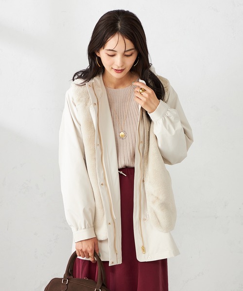 ◆毎シーズン好評!マルチな着こなしが叶うライナー付きブルゾン◆ 【デザイン】 ・デイリーアウターとしておすすめのフーデッドブルゾン ・使い勝手の良いミディ丈 ・ウエストのドロストですっきりしたシルエットに調整可能 ・バックヨークはフレアデザインでバックスタイルも女性らしい印象 ・程よくゆとりのあるサイズ感でさっと羽織れます ・付属はゴールドパーツできれいめに仕上げました ・取り外し可能なフェイクファーのライナーベストは単品でも着用可能 ・ライナーをアウターの上に羽織るのも◎ 【素材】 ・ブルゾンは程よくハリ感のある生地感 ・ライナーは肌触りの良いふわふわのフェイクファー 【コーディネート】 ベーシックなカラーなので、シンプルコーデはもちろん、カラーニットや柄ボトムなど幅広いアイテムとマッチします。 使い勝手のよいミディ丈でデイリーから通勤までシーンレスに活躍。 -------------------- 透け感:なし 裏地:あり 伸縮性:なし 光沢感:なし 生地の厚さ:ふつう -------------------- ≪お気に入り登録機能の使い方≫ ■商品のお気に入り登録(ハートマークをクリック) 再入荷通知や値下げ等、お得なご案内を受けることができます。 -------------------- ※商品画像は、光の当たり具合やパソコンなどの閲覧環境により 実際の色味と異なって見える場合がございます。 商品の色味の目安は商品単体の画像をご参照ください。 ※34(XSサイズ)・42(XLサイズ)はWEB・一部限定店舗での販売です。