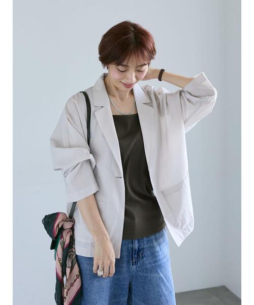 ゆったりとしたドルマンスリーブが魅力的なジャケット。 軽やかなシアー素材を使用し、さらりとした着心地を実現します。 前後差のある裾の長さが流れるようなスタイリングを演出。 季節の変わり目のお出かけコーデに大活躍するアイテムです。 ※商品画像は、撮影環境やお客様のご利用のPC・スマートフォンのモニター環境などにより実物と色味に差異がある場合がございます。 【その他採寸】 F 着丈:[前]61.5cm[後]67.5cm