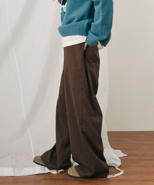 マットな質感と程良いハリを持つポリエステル生地を使用したシワになりにくいイージーパンツ。■デザイン/素材ワイドシルエットでゆるっとしたルーズ感のあるシルエットが魅力のツイルタッチパンツ。ウエストはドロスト付きの総ゴム仕様でストレスフリーな履き心地。ゆとりのあるワイドシルエットに加え、あえて太めにしたドロストがアクセントとなり、シンプルながらも気取らないカジュアルスタイルを演出。ラフになりすぎないリラックススタイルを叶える、デイリーユースにぴったりな一本です。■スタイリングラフなロンTやスウェットを合わせるだけでこなれたリラックススタイルに。また、チェック柄のネルシャツを羽織って季節感を取り入れるのもおすすめです。ベーシックなカラー展開のためシーズンレスに楽しめ、ジップパーカーからシャツ、ニットやスウェットまで様々なスタイリングをお楽しみいただけます。……………………透け感 : なし厚さ:普通伸縮性:なしお手入れ方法:手洗い推奨……………………※ご注意※・屋外の光や照明の当たり具合で、実際の商品の色味とカラー別画像の色味に若干の違いが発生する場合がございます。・詳細画像と併せてご確認の上、ご注文いただきますようお願い致します。【MERLOT】ジャンルレス、ジェンダーレスをテーマにヴィンテージライクからモダンなアイテムまで幅広く展開。 メンズとレディース、カジュアルとモード。あらゆる境界を取り払うミックススタイルを提案します。【商品のお気に入り登録】完売カラーの再入荷通知やラスト1点の通知、プライスダウンの通知を受け取ることが出来ます。【ブランドのお気に入り登録】新商品や再入荷など、嬉しい情報を受け取る事が出来ます。ぜひご登録ください◎※ご注文いただいた予約商品のお届け時期の確認は、注文履歴ページより行えます。ストリート/シティ/シティボーイ/シティガール/メンズライク/テック/ノームコア/古着ライク/ カジュアル / トレンド / オールシーズン /秋服/冬服/ユニセックス