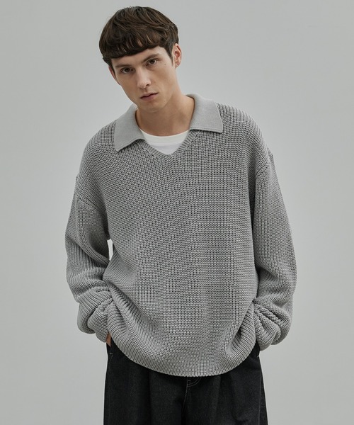 <素材> ドライ感のあるギマコットンを採用。 コットンだけでは重たくケアがしにくいのに対して数本だけポリエステルの糸を引き揃えて膨らみと形態安定性を出しております。 また、タンクトップの上に着用して素肌に触れても肌当たりが良い様に撚糸の際に加工を施しております。 <デザイン> 抜け感のあるざっくりとしてスキッパーニットです。 コットンチノパンツやカーゴパンツとも相性が良く、今の時期はトップスとして、10月頃になればブルゾンのインナーとしてご着用頂けます。