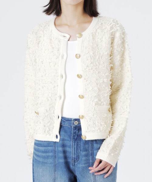 ツイードとコンビになった存在感のあるニットカーディガン 【素材】 前身頃と袖に使用したツィード部分は、羽のようなモール糸と光沢のあるフィルム糸を織り交ぜた、上品で立体感のある表情が魅力。 ニット部分に、天竺編みでしっかりと仕上げることで、程よい厚みと高級感のある風合いに。 袖裏には滑りの良い裏地付きで、着心地にも配慮されています。 【シルエット/デザイン】 異素材をミックスしたコンビデザインが印象的なカーディガン。 ツィードのクラシカルな表情とニットの柔らかさが調和し、程よくモードで上品な佇まいに。 フロントにはゴールドのメタルボタンを配し、アクセサリー要らずの華やかさを添えています。 【スタイリング/その他】 ジャケットのような見え感で、羽織るだけでコーディネートを格上げしてくれる一枚。 きれいめパンツやタイトスカートと合わせてオンスタイルに、 デニムやワイドパンツと合わせてカジュアルダウンした着こなしもおすすめ。 ツィードの華やかさとニットの着やすさを兼ね備えた、大人のための上質カーディガンです。 ━━━━━━━━━━━━━━━━━━━━━━━━━━ お買い物をお楽しみ頂くために <商品のお気に入り登録> 完売カラーの再入荷通知など、お得な情報をお届けします。 <注意事項> この商品はサンプルでの撮影を行っています。 実際の商品とイメージが異なる場合がございます。 撮影環境により、光の当たり具合で色味が違って見える場合があります。あらかじめご了承下さい。