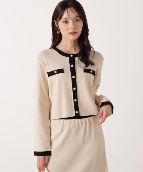 配色ラインが目を引くニットジャケットです。 ゴールドカラーで縁取ったパール調ボタンが上品な印象をプラス。 スカートはもちろん、デニムパンツと合わせた、カジュアルなコーディネートでも女性らしい雰囲気で着回せます。 同素材のニットスカートとのSETUPスタイルもお勧めです。 <素材> 暖かみのある糸を使用しています。 <詳細> 仕様・前ボタン 裏地・なし 透け感・なし / 光沢・なし / 伸縮性・あり 生地の厚さ・普通 <シリーズ> ■ニットスカート[品番:1215220925] ※モデルの着用画像の場合、光の当たり具合により、実際の色味と異なって見えることがございます。 色味は、商品単体の画像をご参照ください。 <商品のお気に入り登録> お気に入りアイテムの値下げ・再入荷・在庫1点などの通知を受け取ることができる 便利機能ですので気に入ったアイテムはお気に入り登録がおすすめ! <ショップのお気に入り登録> 新商品や再入荷、セール、クーポン配布などお得な情報を受け取ることができます。 ●撮影はサンプル商品で行っている為、仕様とサイズが異なる場合がございます。 ●スタジオ及び屋外で撮影した着用画像は、光の当たり具合で色味が違って見える場合があります。予めご了承ください。