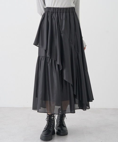 艷やかでシャイニーな素材が上品に演出してくれるデザインスカート。ほんのりシアーでとろみのあるドレープが女性らしいシルエットです。斜めに重ねたラッフルディテールがより印象的な動きをプラス。ウエストギャザーゴム仕様でタックインスタイルもきれいに決まり、様々なシーンで活躍してくれるおすすめのアイテムです。透け感[ややあり]生地の厚さ[普通]光沢感[ややあり]伸縮性[ややあり]裏地[あり]ポケット[なし]※モデル着用画像は光の当たり具合で色味が違って見える場合がございます。商品の色味は物撮りの画像をご参照ください。● earth music&ecology ●(アースミュージック&エコロジー)「いいことある服。」たかが服。されど服。波風の多い日々のなかでもほほえんで前を向くあなたを、つつんで一緒に歩きたい。 いいことあるかも。そんな期待までまとえる服をあなたに。earth music&ecologyは、毎日を頑張る女性たちをちょっと前向きにするブランドです。 ▼ 商品のお気に入り登録がおすすめです ▼商品ページ内の「♡」ハートマークをクリック。完売時の再入荷や、最後の1点の通知、コーディネート画像がアップされたとき、お得なお値下げの際の通知を受ける事ができます。【お知らせ】ページでも通知が確認できます。