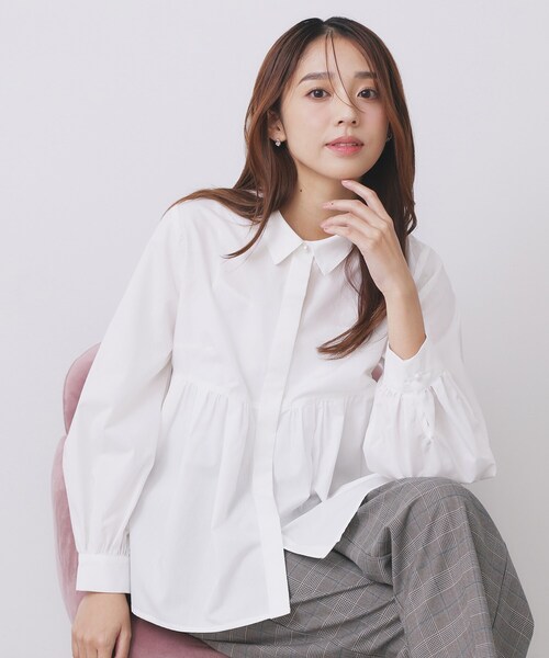 ラメのラインが華やかさをプラスしてくれるトレンドの衿付きペプラムブラウス【デザイン】・ラメのラインがさりげなく入ったブロード素材が、上品で洗練された印象を与えます。・ウエスト切り替えのペプラムデザインが、女性らしいシルエットを演出し、スタイルアップ効果も期待できます。・衿付きのデザインがきちんと感をプラスし、オフィスからカジュアルまで幅広いシーンで活躍します。・すっきりとしたシルエットなので、アウターも着用しやすく、3シーズン活躍します。・テーパードパンツやタイトスカートと合わせて、きちんと感のあるオフィススタイルに。・デニムやワイドパンツと組み合わせれば、程よくカジュアルダウンした休日コーデが完成します。【素材】・TCブロード素材にラメのラインを施し、控えめな華やかさをプラス。上品な光沢感が魅力です。・防シワ性があり、イージーアイロンなのでお手入れが簡単。忙しい朝でも手軽に整えられます。・マシンウォッシャブル対応で、日常使いにぴったりの実用性を備えています。【カラー】オフホワイト(003)は無地です。※照明の関係により、実際よりも色味が違って見える場合があります。また、パソコン・スマートフォンなどの環境により、若干製品と画像のカラーが異なる場合もございます。モデル情報:身長166cm 着用サイズ:38(M)店舗へのお問い合わせ商品番号:C58-84002●製品寸法:36(S):着丈58cm B92cm 袖丈56cm 肩幅36cm38(M):着丈59cm B95cm 袖丈56cm 肩幅37cm40(L):着丈60cm B98cm 袖丈57cm 肩幅38cm42(LL):着丈62cm B102cm 袖丈58cm 肩幅39cm備考: