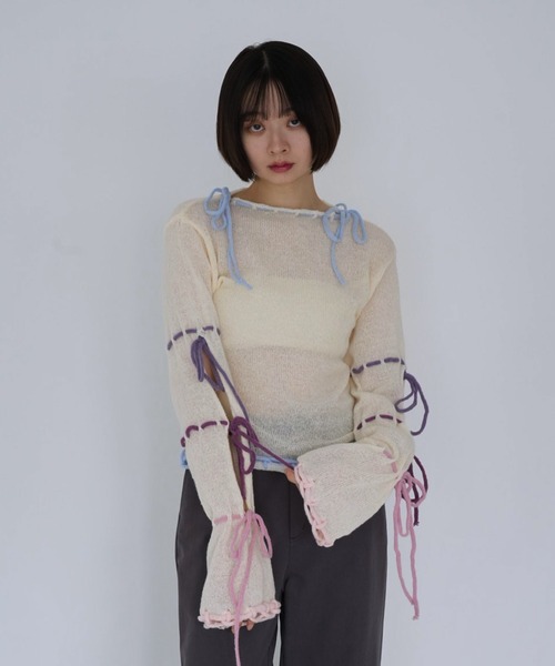 リボンディテールデザインニットトップスribbon detail knit top◆デザインポイントフリルの縁取りと大胆なリボンディテールが魅力のニットトップス。肩・袖・裾に施されたカラフルな紐リボンが、ガーリーで個性的な雰囲気を演出します。袖口は広がりのあるベルスリーブ仕様で、華やかさもプラス。◆スタイリング提案デニムと合わせてカジュアルダウンしたり、スカートと合わせて甘めスタイルにも◎。カラーリボンを主役にした着こなしがおすすめです。◆カラーバリエーション・アプリコット(ピンク・ブルー・パープル系リボン)・ブルー(グレージュリボン)◆素材感・ディテール柔らかくチクチクしにくいニット素材を使用。程よいフィット感で、動きやすさもキープ。体に施された手編み風のディテールがナチュラルな印象に。【ニットトップス・春ファッション】春のワードローブに欠かせないニットトップスを中心に揃えた春ファッションカテゴリ。軽やかな素材感や程よい厚みのニットトップスは、18〜22歳の大学生に人気のアイテムです。春服として取り入れやすく、1枚でコーデが決まるため、春コーデの主役として活躍します。【大学生・新生活・ニットコーデ】大学生の新生活には、通学から休日まで使えるニットトップスがおすすめ。授業のある日やキャンパスライフにも取り入れやすく、気負わず着られるのが魅力です。可愛い印象を残しつつ、カジュアルになりすぎないニットトップスは、春ファッション初心者にも取り入れやすく、毎日のコーディネートに活躍します。【イベント・お出かけ】バレンタインのお出かけや卒業旅行、同窓会、ゴールデンウィークのお出かけにもニットトップスは大活躍。パンツやスカートとも合わせやすく、着回し力の高いニットトップスは、春コーデの幅を広げてくれます。トレンド感のあるニットを取り入れることで、春服らしい軽やかなスタイリングが完成します。※輸送時による多少の汚れ・シワがある場合がございます。※撮影時のライティングやご使用のモニターにより、実際の色味と異なる場合がございます。※サイズはすべて平面置きで採寸したものです。若干の個体差がございます。【商品のお気に入り登録】再入荷やプライスダウンなどの通知を受け取ることができます。【ブランドのお気に入り登録】新商品の入荷情報や限定キャンペーンの通知をお届けします。