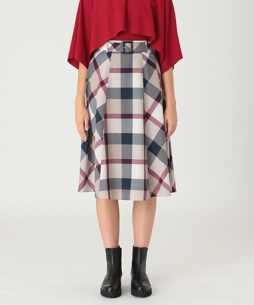 ◆クレストブリッジチェックが華やかなフレアスカート【Design】さらっとしたウール混の素材を使ったひざ下丈のフレアスカートです。バックル付きのウエストベルトがポイントです。合わせるトップスを選ばず、コーディネートに取り入れるだけでブルーレーベルらしいスタイリングが完成するアイテムです。