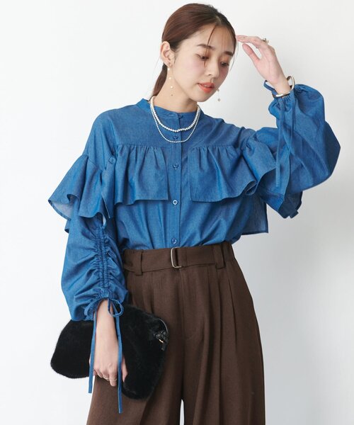 存在感のある主役級デニムブラウス商品ポイント・目を惹くフリルデザインが、着るだけでコーディネートを華やかにしてくれるブラウスです。・スタンドカラーが首元をすっきりと見せ、甘すぎない大人の可愛らしさを演出♪・コットン混の柔らかなデニム素材で仕立てられ、着心地にも優れています◎おすすめコーディネート袖口リボンをきゅっと結んで、ふんわりしたスリーブシルエットで着用するとより大人ガーリーな雰囲気に◎フレアスカートやプリーツスカートと合わせて、フェミニンな着こなしもおすすめです。素材綿70%ポリエステル30%洗濯方法:洗濯機洗い可(弱)透け感:なし裏地:なし伸縮性:なし生地の厚さ:普通光沢:なしポケット:なし--------------------------------------------------------------------------------【注意点】※画像の商品は光の照射や角度、お使いのモニター環境により、実物と色味が異なる場合がございます。※入荷状況により、お届け予定が前後する場合があります。※工場の生産の都合上、納期が変更になる場合がございます。検品や輸送の関係で、発送日が前後しますのでご了承ください。 また、入荷状況により、お客様への発送が店頭販売より遅れる場合もございます。※追加生産商品は、一部の店舗、通販で販売中の場合がございます。予めご了承下さい。※サンプルでの撮影、計測をしております。商品の仕様が一部変更になる場合がございます。※撮影サンプル品はブランドタグがついておりません。製品にはタグがつきますので、製品の表に縫い糸が見える場合がございます。--------------------------------------------------------------------------------【お買い物をもっと便利に楽しく♪】『ハート』をクリックでお気に入り登録〇「商品のお気に入り登録」で・・・ ラスト1点や再入荷の通知が届きます。登録して頂いた商品だけが対象となる、あなただけのタイムセールが開催されることも!〇「ブランドのお気に入り登録」で・・・ 新商品や再入荷など、いち早くブランドのお得な情報を受け取ることができますので、ご登録をおすすめします!--------------------------------------------------------------------------------