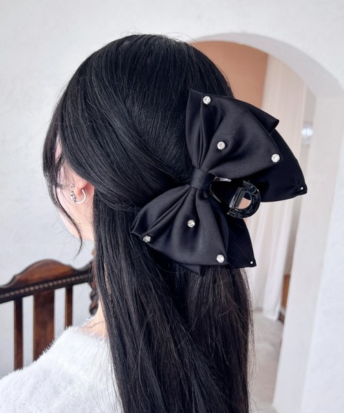 【オンオフ問わずに活躍するサテン素材のリボンクリップ】 サッと留めるだけでアップヘアも簡単にまとまります。 つまみ部分がカーブしているので持ちやすいのも◎ クリップ部分は大きめなので髪の多い方でもしっかりホールドできます。 ツヤのあるサテンで大人っぽく華やかに。 パールビジューやラインストーンがきらめくアクセントになっています。