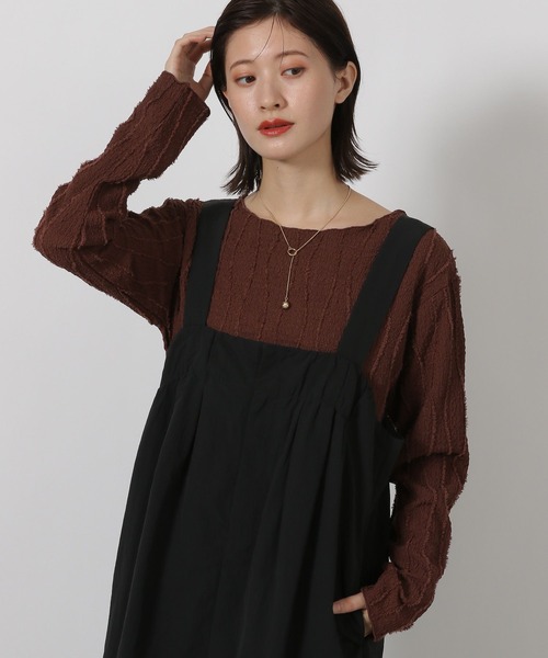 表面感のある素材が特徴のトップス。伸縮性のある生地感でタイト見えのシルエットでも着心地が楽な1枚です。デコルテが綺麗に見えるネックデザインもポイント。【素材】表面感のあるフリンジジャガード生地。【スタイリング】1枚着はもちろん、サロペットなどのインナーとしてもおすすめ。