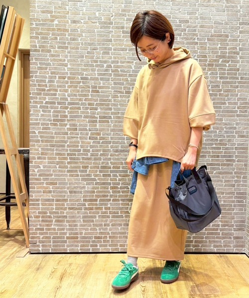 【セット企画】パーカー+スカート ランタンスリーブの袖デザインが入ったパーカーとタイトスカートの日常使いに最適なセットアップです。 軽めのダンボール素材を使っているので、肌触りが良く、柔らかく、着心地が良いのが特徴です。 バラして着用できたり、着用シーズンが長いので1セットあると便利です。 ■point 【トップス】 腕に入った切替えによりシンプルながら気の利いた、ランタンスリーブパーカーに仕上がっています。 左袖口にさりげなくブランドのワンポイント刺繍が入っています。 袖口や裾にリブを使っていないのでベーシックなイメージで着用できます。 【スカート】 タイトなラインですがダンボール素材の伸縮性により、圧迫感なく楽に着用出来ます。 後ろにスリットが入っています。 ■detail 【トップス】 左袖口に配色「gp」刺繍あり 前裾前スリットあり 【スカート】 ウエスト総ゴム 後ろ接ぎ+スリット ポケットあり ■fabric …………………… 透け感:なし 裏地:なし 伸縮性:あり 光沢感:なし 生地の厚さ:中肉 洗濯方法:洗濯機洗い可能 …………………… ※詳しいお手入れ方法は商品タグをご参照ください ■coordinate *バラして着用したり、そのままセットで着用したり自由にコーディネート可能です。