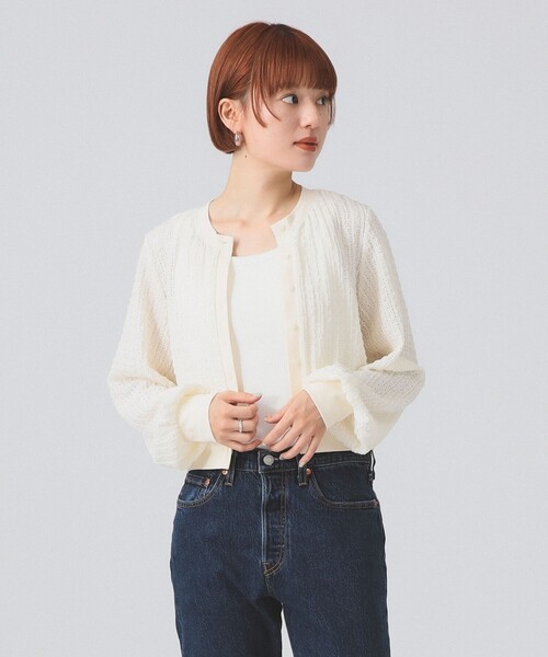 ぽこぽこ素材のレース風カーディガン■デザイン表面に立体感のあるレース風の生地が特徴的な、カットソーカーディガン。 襟元や袖口はなめらかな天竺素材を使用し、シンプルながらも洗練されたデザインに仕上げました。■コーディネート短めの丈なので、ワンピースやスカートとの相性も抜群。スタイルアップ効果も期待できます。きれいめな印象で、ちょっとしたお呼ばれやフォーマルなシーンの羽織りとしても活躍する1枚です。■サイズ程よいゆとりを持たせつつ、ボディラインに馴染むすっきりとしたシルエット。■ケア方法洗濯可(詳細は商品についている品質表示ラベルをご覧ください)【OFF WHITE】BEAMS STAFF:H164 Size:ONE SIZE【BLACK】Model:H:165 B77 W57 H85 Size:ONE SIZE※光の当たり具合やパソコンなどの閲覧環境によって、実際の色味と異なって見える場合がございます。予めご了承ください。※商品の色味は商品単体で撮影した画像をご参照ください。