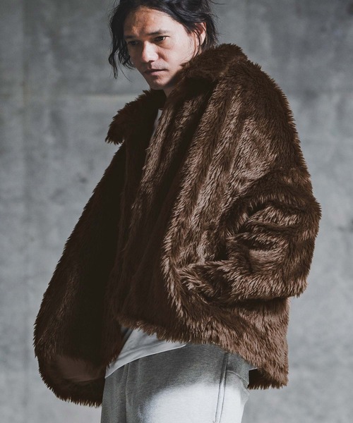 175cm B90-W73-H89 靴26.5cmのモデルがMサイズを着用。フェイクファーを使用した、際立つ存在感のジャケット。ボタンレスのミニマルなデザインが、洗練と存在感を調和させたモダンな一枚です。【デザイン・ディテール】フェイクファーの質感を引き立てる、フロントはボタンレスのミニマルなデザイン。余計な装飾を省くことで、素材そのものの表情とシルエットの美しさが際立ちます。【ファブリック】毛足の長いシャギーなフェイクファー。リアルファーのような高級感を持ちながら、軽量で扱いやすく、動物由来素材を避けたい方にもおすすめです。裏地は袖通しの良いポリエステルタフタ。【シルエット】腰丈の着丈に加え、肩幅・身幅に程よくゆとりを持たせたリラックス感のあるボックスシルエット。フェイクファーのボリュームを活かしながらも、着膨れしにくいバランスです。※着用画像と商品単体画像で色が異なる場合がございます。※商品単体画像を実物により近づけております。