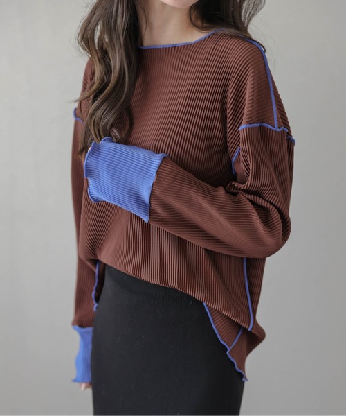 異素材ミックスが織りなす個性あふれるプリーツトップスバイカラー切り替えスリーブが目を惹くプリーツカットソー。シンプルながらも、配色ステッチがアクセントになった一枚。どんなボトムスにも合わせやすく、いつものスタイリングに個性をプラス。さらりとした肌触りの良い生地感でストレスフリーの着心地。Point 01個性をプラス大人可愛いアクセント配色になった袖切替え&パイピングステッチが個性をプラス。シンプルなスタイリングも大人可愛いアクセントで着映えます。Point 02ストレスフリーな着心地も縦ラインを強調する細プリーツ加工が、すっきり細見えを叶え、シワになりにくく肌に触れる面が少ないので、サラリと快適な着心地です。リラックスしたい日にもピッタリ◎【25AW】■Fabricやや光沢感、凹凸感のある細プリーツ加工生地に、配色切替え・ステッチデザイン。---------------------透け感:淡色は若干あり裏地:なし厚さ:薄手伸縮性:あり---------------------▼《お気に入り登録》でお得な情報がいっぱい▼・「商品のお気に入り登録」で再入荷通知や、ラストの通知、セール通知も受け取ることができます。・「ブランドのお気に入り登録」で新商品や再入荷など、お得な情報を受け取ることができます!