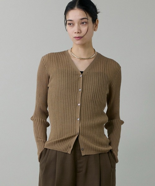 ■デザインキラキラした素材感を活かすために、デザインはあえてシンプルなVネックカーディガンに。縦目がスッキリと見えるリブの巾と、デコルテを美しく見せるネックラインの深さにこだわりました。ワイドリブですが体のラインを拾いにくいサイジングで、スタイリングに女性らしい表情をプラスしてくれます。合わせるボトムスを問わず幅広いシーンで活躍してくれるアイテムです。■素材植物のセルロースを原料とした再生繊維のレーヨンと、耐久性、強度、速乾性に富んだポリエステルを撚り上げた繊細で高級感のある素材です。さりげないきらめきが華やかなスパークタイプの糸で、ドライタッチで清涼感のある風合いが特徴です。編み目の大きさを調整することにより適度なシアー感が出るように編み上げました。・水洗い可■サンプル撮影商品画像の商品はサンプルです。実際の商品とはサイズや色味、素材、デザイン等の仕様が若干変更になる場合がございます。