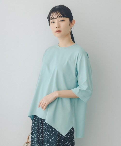 汗じみを気にせず きれい見えかなう。コットンなのに、汗じみができにくいトップス。ゆったりシルエットとイレギュラーヘムで、ほどよくきちんと感も。カジュアルになりすぎない、衿ぐりの開きもポイント。汗じみが気になって避けていた色もこれなら安心。※フェリシモの商品には、紐などでくくられている紙タグは付属しておりません。