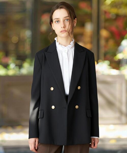 【好評のウールブレンドのダブルブレストテーラードジャケット】●スッキリとしていてマニッシュな印象のテーラードジャケット●ストレッチ性があり着やすい●細番手のウールを使用したラグジュアリーな素材●こだわり程良くゆとりのあるシルエットに、ピークドラペルで少し辛口な印象にしたブレザー。袖口を折り返すことで現れるストライプ柄が、スタイルのアクセントになります。メタル釦を使用し、トラッドな印象ですが女性らしい雰囲気があります。ポケットや衿の切り替えの位置、角度など、着た時にスタイル、バランスが良く見えるようにこだわりました。●素材2/72の細番手の梳毛ウールを使用したらラグジュアリーな素材。ポリエステル混でシワに強いので、長くご愛用いただけます。また、ストレッチ性もあるので、キチンと感がありながら着やすさも兼ね備えたジャケット。上品な微光沢があります。※照明の関係により、実際よりも色味が違って見える場合があります。また、パソコン・スマートフォンなどの環境により、若干製品と画像のカラーが異なる場合もございます。店舗へのお問い合わせ商品番号:085-44003●製品寸法:34(SS):着丈66cm B98cm 袖丈57cm 肩幅40cm36(S):着丈67cm B101cm 袖丈58cm 肩幅41cm38(M):着丈68cm B104cm 袖丈59cm 肩幅42cm備考: