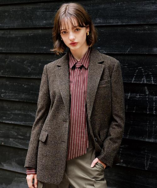 【尾州で織られた国産ならではのラグジュアリーなウールを使用した、クラシカルでマニッシュなジャケット!】 ●ジャケットの顔となる衿のパターンにこだわり ●トレンドとドレステリアの今期テーマにマッチしたマニッシュな1着 ●丁寧に織り上げられた国産ウール素材を使用 ●こだわり クラシカルでメンズライクなムードにこだわったテーラード。 トレンドの大きめラペルやカッチリとした肩回りを意識しながら、着やすいバランスに落とし込みました。 メンズっぽさを意識しながらも、女性らしい印象に仕上げたこだわりの詰まったジャケットです。 袖裏にはシックな印象のストライプ柄を使用。 袖を織り上げて柄×柄を見せるのもこなれ感がありお洒落です。 ボトムはワイドなどのパンツ合わせがおすすめですが、ボリューム感のあるスカートと合わせるのもマッチします。 ●素材 世界有数のテキスタイル産地である「尾州」のウール素材。 縦にループ糸を使用。 横は2種類の希少なランダムにちりあめられたカラーネップ糸を組み合わせる事で、深みのある色調と豊かな立体感を出しています。 とても仕立て映えのするしっかりとしたウール素材ですが、見た目に反してとてもソフトで膨らみがあるので、軽くて着やすいジャケットに仕上がっています。 袖の裏地もキュプラのストライプ柄を使用しているので、とても滑りが良く着心地が良い。 ※照明の関係により、実際よりも色味が違って見える場合があります。また、パソコン・スマートフォンなどの環境により、若干製品と画像のカラーが異なる場合もございます。 店舗へのお問い合わせ商品番号:085-44005 ●製品寸法: 34(SS):着丈67cm B94cm 袖丈58cm 裄丈76cm 肩幅39cm 36(S):着丈69cm B97cm 袖丈59cm 裄丈78cm 肩幅40cm 38(M):着丈70cm B100cm 袖丈59cm 裄丈80cm 肩幅41cm 備考: