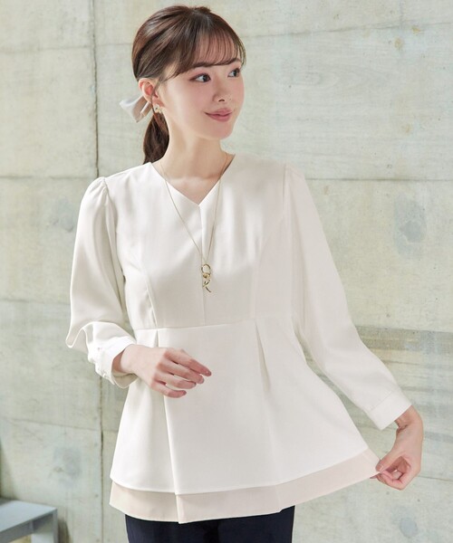 ハリ感が魅力のダブルクロス素材を使用した、きちんと見えするブラウスです。 裾のレイヤードデザインがアクセントになり、気になるヒップ周りをさりげなくカバーしてくれます。 スタイル良く見える位置に入った切り替えとタックデザインが、着るだけでスタイルアップを叶えます。 袖口と後ろ開きのパールボタンが大人可愛い印象をプラスし、細部までこだわったデザインです。 レイヤード部分はとろみのある生地を使用しており、上品な印象を与え、配色がコーディネートのポイントになります。 お手持ちのパンツに合わせるだけで旬顔コーデになる1枚。 もちろんご自宅でお手入れして頂けます。 ■DESIGN ・胸元:Vネック ・釦:あり ■MATERIAL ・透け感:なし ・伸縮性:なし ・裏地:なし ■LAUNDERING ・手洗い可 -------------------------------- ▼この商品の大きいサイズはこちら BLFUGA6102(店舗番号) -------------------------------- 洗濯表示 40℃まで手洗い可 漂白不可 タンブル乾燥不可 日陰つり干し乾燥 アイロンは120℃まで ドライクリーニング不可 非常に弱いウェットクリーニング可
