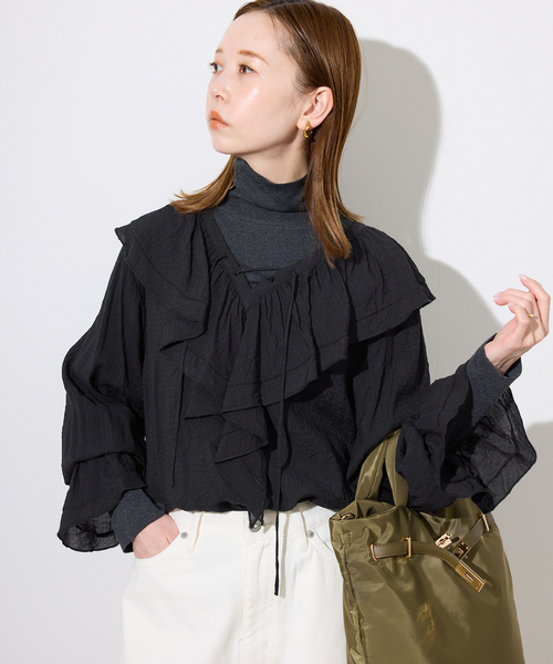 手洗い可能【2025AW】SLOBE IENAPOINT・さりげないストライプで表情感のある生地を使用した着映えブラウス。【素材の特徴】薄手でシアー感のある軽やかな生地で、秋初めから着やすい素材です。【デザイン】胸元のレースアップがデザインポイント。大きめのラッフルもVネックで甘すぎない印象に仕上がりました。【コーディネート】ジャケットやカーデなどにレイヤードして着ていただけて着回し力も◎ **********************透け感:ややあり裏地:なし伸縮性:なし光沢感:なし生地の厚さ:普通**********************《スタッフ名:Sally》年齢:30代後半/身長:162cm/体型:細身/普段サイズ:M/着用サイズ:フリーサイズ感:長すぎず短すぎない着丈でインでもアウトでもバランス取りやすいです。身幅は程よくゆとりがあります。素材感:やや透け感のある軽めの素材。着心地:窮屈感なく、楽な着心地。冬にはニットとレイヤードもしやすそうです。**********************※取り扱いについては、商品についている品質表示でご確認ください。こちらの商品は、SLOBE IENAでの取り扱いになります。直接店舗へお問い合わせの際はSLOBE IENA店舗へお願い致します。※照明の関係により、実際よりも色味が違って見える場合があります。またパソコン・スマートフォンなどの環境により、若干製品と画像のカラーが異なる場合もございます。予めご了承ください。※商品の色味は、商品アップ画像をご参照ください。本体:手洗い可能