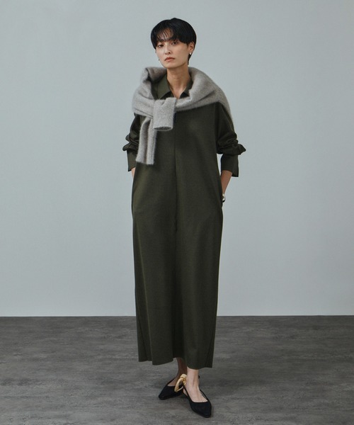 襟元のファスナーで印象を自在に変えられる、上質ウールを使用したシャツワンピース■デザイン / シルエットシャープな衿とコンシールファスナーがポイントのナローシルエットシャツワンピース。本革のファスナースライダーや、前後中心・ヨーク部分に施した特殊ミシンにより、縫い代を無くすことで軽やかで快適な着心地と高級感ある仕上がりを実現。その他の部分は断ち切り仕様とし、モード感のあるディテールアクセントを効かせたデザインです。■素材国内加工場で丁寧に仕上げたウール100%ミルドスムースを採用。1/60梳毛糸をスムース組織で編み立て、ミルド加工によりフェルトのような温かみを持たせつつ、さらにシルキー加工で上品な光沢と滑らかな風合いを実現。秋冬のコーディネートを格上げする上質素材です。■コーディネートファスナーを閉じればきちんと感のあるスタイルに、開ければリラクシーな抜け感を演出。一枚で着ても、ロングコートのインナーとしても映える万能ワンピース。ブーツでシックに、スニーカーでカジュアルにと幅広いスタイリングにマッチします。■モデル身長:173cm 着用サイズ:F(ロングヘアモデル)■モデル身長:165cm 着用サイズ:F(ショートヘアモデル)-----------------------------裏地:なし光沢感:なし透け感:なしウエスト:ゴムなしポケット:あり伸縮性:なし生地の厚さ:やや薄手-----------------------------