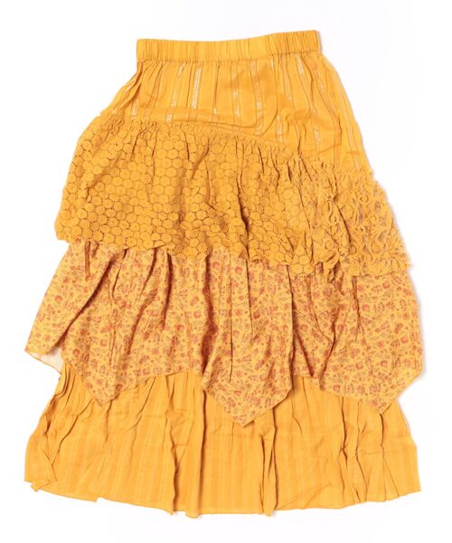 2種類のレース生地と艶やかなプリント生地、ラメ糸の入ったコットンドビー生地を組み合わせたロングスカート。コーデの雰囲気をがらりと変えてくれる華やかなデザインです。※こちらの商品は1点1点職人による手作りとなります。その為、生地の取り方により柄の配置や形・色合いなど若干異なる場合がございます。あらかじめご了承ください。※屋外での撮影画像は、光の当たり具合で色味・カラーが違って見える場合がございます。商品のカラーは、スタジオ撮影の画像をご参照ください。Amina Collection Co.,LTD.