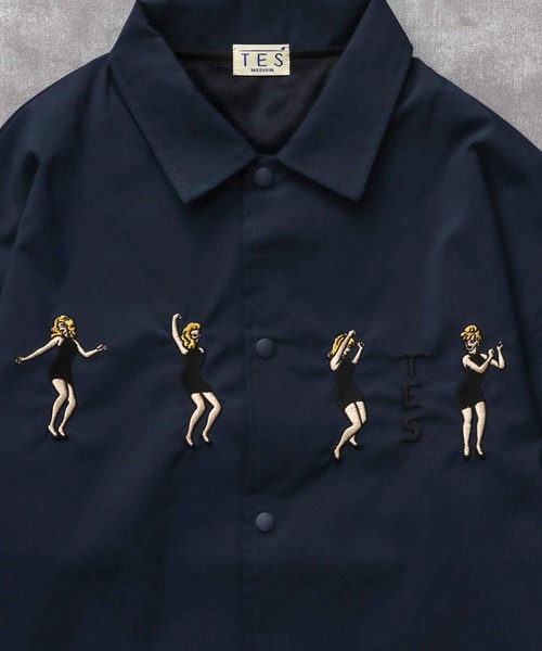 TES GOGO DANCER EMB COACH JACKET / コーチジャケット1960年代に流行したゴーゴーダンサーを刺繍で表現したユニークなコーチJKTが登場。ややマットな質感の肌触りの良い素材を使用したコーチジャケットが登場。裏地はメッシュを使用、適度な保温性は季節を問わず着用できるアイテムです。ベーシックなカラーリングで着まわしやすいアイテムです。TES(TheEndlessSummer)1964年制作以来50年以上経った今も、サーフィン映画の最高峰として評価が高い伝説のサーフ・ムービー「The Endless Summer」。映画の世界観にOLD SURFとARTを織り交ぜ新しくも懐かしいリラックススタイルを提案していきます。