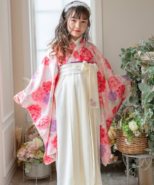 織柄入り花柄生地で高見えも欲張って 3ステップで簡単! 袴一体型着物ワンピース ワンピースを着る感覚で完璧な袴スタイルが叶う 簡単着付けを極めた袴セットに、 高見えがする織柄入り花柄生地バージョンが登場しました。 特別なアイテムも着付けの知識さえも不要、 パーツはすべて一体型となった大胆構造で、 簡単、楽々でも見事な見映えをお約束! つや感と奥行きのある高級感あふれる生地が魅力 ・ナチュラル・ブルー・モーブ系 ばらや小花などが描かれた洋風の織り柄入り ・ミント・ネイビー系1・ネイビー系2・サックスブルー・レッド・イエロー・パープル・ピンク・スカイブルー 満開の桜が一面に広がる和風の織り柄入り セット内容:袴一体型着物ワンピース、帯枕 ◆オールインワン! 袴一体型着物ワンピース◆ 上衣と袴がドッキングしたオールインワン構造の着物ワンピース。 同梱のリボン型帯枕をゴム部分に通してお使いください。 POINT: - “3ステップ”で袴スタイルが完成! 「背中ファスナーで本体着物を着る」、 「帯枕を通したゴムベルトをウエストボタンに留める」、 「袴スカートをはいて紐を結ぶ」、この3ステップで憧れの袴スタイルが叶う! - コツいらずで完璧な見映え! 袴はウエスト少し高め、胸元に近い位置で履くとスタイリッシュ。 前面は袴スカートが着物と縫い留めてあり位置が決まっているため、サッと着るだけでかっこよく着こなせます。 - オールインワンだから着崩れにくい!襦袢を下に着ているように見える襟元は縫い留めてあるからはだける心配もなく、 着物と袴スカートも前面は縫ってあるため、着崩れにくいつくりとなっています ※背面は縫い留めていないので、椅子に座る際は袴を少し持ち上げて座るよう、お子さんに教えてあげてください DETAIL: -重ね襟、膨れジャガードの上品な半襟がのぞく本格デザインで、これ一枚での着用が可能。 寒さ対策や、よりおしゃれな着こなしを楽しみたい方は下にお気に入りの肌襦袢を着ても -前面は袴スカートが着物本体に縫われている大胆なオールインワン構造 -白色袴・亜麻色袴のみ透け防止のため裏地付き COLOR:12色 ナチュラル:ゴブランナチュラル×茶袴 ブルー:ゴブランブルー×白袴 モーヴ系:ゴブランモーヴ×長春色袴 ミント:八重桜薄青×白袴 ネイビー系1:八重桜レーヴ×亜麻色袴 ネイビー系2:藤の香濃紫×淡藤色袴 サックスブルー:ダリアエクラ×菫色袴 レッド:いにしえ華車赤×亜麻色袴 イエロー:いにしえ華車黄×桃色袴 パープル:いにしえ華車藤×菫色袴 ピンク:猫と芍薬桃色×白袴 スカイブルー:猫と芍薬空色×紅藤色袴 ・伸縮性:なし ・生地の厚み:普通 ・透け感:なし ・ポケット:なし ・着物裏地:あり ・袴裏地:白色袴・亜麻色袴のみあり ※サイズ詳細は商品画像をご確認ください ※モデルが着用している帯飾りは別売りです(商品コード:87184017) ※商品の素材や色合いなど、生産時期によって差異が生じます