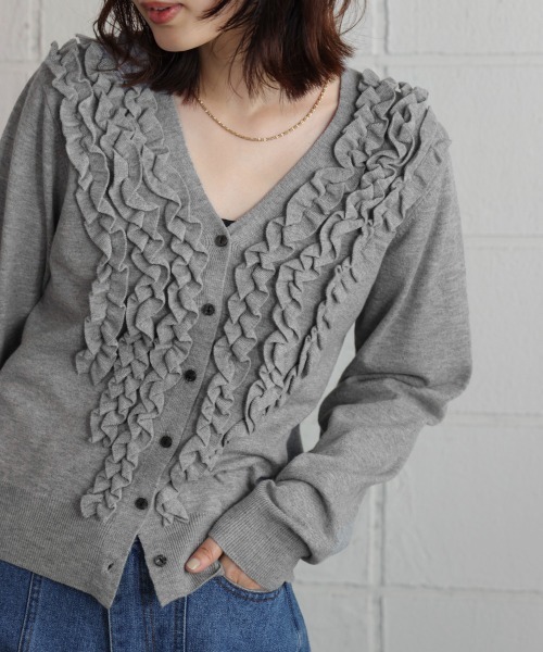 ■POINT 可憐なフリルが胸元を彩り、視線を惹きつけるカーディガン。深めのVネックが、デコルテを美しく演出し、女性らしい魅力を最大限に引き出します。計算された短丈デザインは、スタイルアップ効果も抜群。カジュアルからフェミニンまで、幅広いコーディネートで活躍する、ワードローブの定番アイテムです。 ■FABRIC 中肉のニットで収縮性と柔らかさがあり、肌触りが気持ちいいです。 ■COORDINATE インナーにはTシャツやタートルを、ボトムにはスカート、ワイドパンツ、デニムなどコーディネイトに活躍すること間違いないアイテムです。 ………………… 透け感:なし 裏地:なし ………………… ★商品のお気に入り登録 登録すると、完売しても再入荷時に通知を受け取ることができます。 ほかにもお得な特典があるかもしれません♪ ★ブランドのお気に入り登録 新商品や再入荷などの情報を受け取ることができますので、是非ご登録ください♪