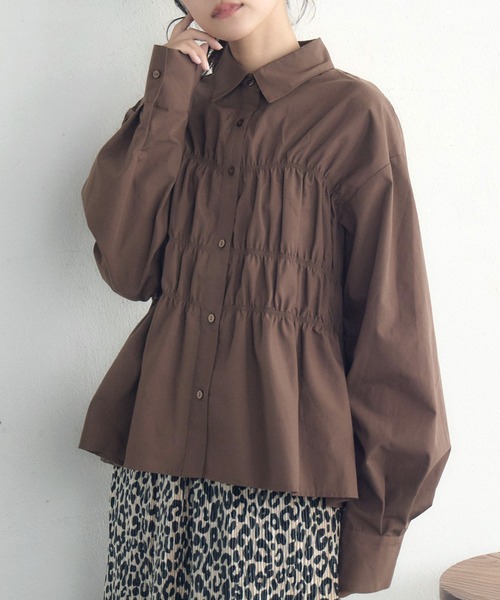 <春から大人気のギャザーシャツシリーズが長袖で再登場>▼デザインこの春から夏にかけて最も大人気を頂いたシャツアイテム。胸元のギャザーは今年トレンドのデザインです。秋らしく落ち着いた袖口にブラッシュアップし、羽織スタイルでも着て頂けるので、秋も大活躍♪着丈も少し長くなり、体型カバーも叶います。▼コーディネートボトムを選ばない使いやすいデザイン。フェミニンからカジュアルまでボトム次第でアレンジ可能です◎------------------------------生地感:普通伸縮性:ある透け感:なし裏地:なし------------------------------▼ブランド紹介RETRO GIRL (レトロガール)自分らしい“ベーシックアイテム”と新しい自分の”トレンドアイテム”が見つかる場所今らしいファッションを楽しむ女性のためのブランド#シャツ #シャーリング #シャーリングシャツ #トレンドアイテム #甘めシャツ #ギャザー #ギャザーシャツ #秋コーデ▼注意事項※撮影環境やモニター環境によって実際の商品とお色味が 多少異なってみえる場合がございます。品番:RF556623B003 / 品名:シャーリングペプラムSH