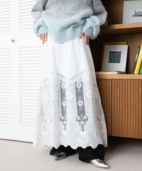 トレンドのレイヤードスタイルがサマになるアイテム◎ ■おすすめの着こなし ☆カジュアルスタイルには・・・ デニムにレイヤードして着こなす、トレンドライクなスタイルが◎ トップスはロンTやシャツなどのベーシックなアイテムを合わせても着映えします。 ☆きれいめスタイルには・・・ スラックスやリブパンツと合わせることで、クリーンな雰囲気で着用いただけます。 ジャケットなどと合わせればより、女性らしい落ち着いた印象に◎ ■ポイント レイヤードスタイルにぴったりなロングスカート。 ぐるりとあしらわれた刺繍デザインが目を惹くアイテムです。 ウエスト部分はゴム仕様なので、ノンストレスな穿き心地◎ ペチコートを使用すれば一枚でスカートとしてもお楽しみいただけます。 ■素材 程よくハリ感があり、着心地抜群のコットン100%素材を使用。 着合わせ次第で幅広いスタイリングを楽しめるアイテムです。