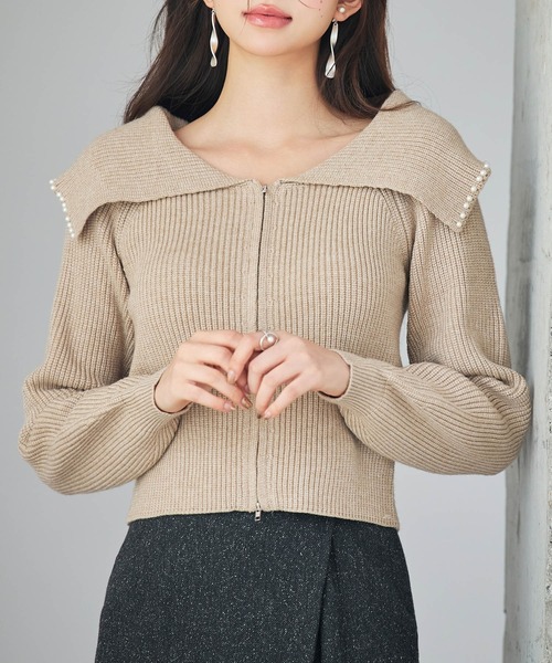 首元コンシャスなパール付きワイドカラーのショート丈リブニットカーディガン。 ■ダブルジップ ファスナー開閉の前開きニットアウターです。ダブルジップで上下どちらからも開閉可能。開け方のアレンジで個性が光ります。 ■印象たっぷりビックカラー デコルテをきれい見せるカーディガンネックのネックラインに、肩を覆うほどのワイドなフラットカラーがついた特徴的なネックデザインです。顏周りにボリュームが出るので、相対的に小顔効果も期待できます。 襟の縁には小ぶりのパールビジューがあしらわれ、さりげなくフェミニンに。 ■立体感のあるリブニット 編地のストライプラインが表情豊なリブニットのカーディガンです。やや厚みのあるニット地で体のラインを拾いにくいデザインです。 ■細見せふんわりタックドカフス 袖口は折りたたんで絞ったタックドカフスです。袖はふんわりと膨らみがあり、袖口は手首にフィットするシルエットなので、腕を細く印象づけられます。