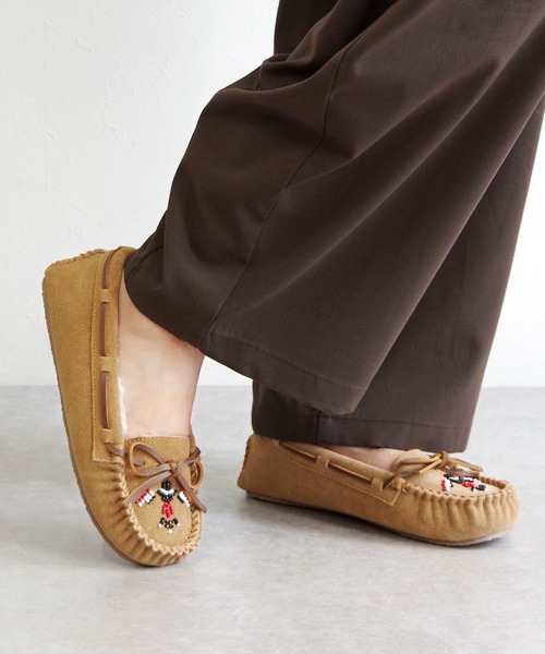 25AWふんわりとしたボアライニングで足元を優しく包み込む、MINNETONKA(ミネトンカ)の人気ビーズモカシン。アッパーは柔らかなスエード素材を使用し、履くほどに足になじむ快適なフィット感を実現。甲部分にはミネトンカならではのビーズ刺繍を施し、温かみのあるハンドクラフト感を演出しています。軽量で柔らかなアウトソールは歩きやすく、ルームシューズとしてはもちろん、ちょっとした外出にも活躍。秋冬のカジュアルスタイルにぴったりな1足です。暖かいボアライニングつま先からかかとまでふんわりと包み込み、寒い季節も快適。ビーズ刺繍デザインハンドクラフトのぬくもりを感じる、アイコニックなデザイン。柔らかなスエード素材履くほどに足に馴染み、リラックスした履き心地。軽量アウトソール室内履きとしても、外履きとしても使える便利さ。カラー展開ナチュラルなシナモンと、シックなチャコールの2色展開でコーデに合わせやすい。【モカシンを長持ちさせるためには】定期的なクリーニング:専用のブラシで汚れを軽くブラッシングします。スエードクリーナーを使用することもおすすめです。防水スプレーの使用:新品のモカシンを購入したら、防水スプレーを使用することで水や汚れを防ぎます。定期的にスプレーを再塗布することが大切です。乾燥:濡れた場合は、直射日光や高温の場所を避け、風通しの良い場所で自然乾燥させます。新聞紙を詰めると形を保ちながら乾燥させることができます。■当店はMINNETONKAの国内正規代理店です■【ブランド紹介】1946年の創業以来、ミネトンカはアメリカン・クラシックの定番になっています。現在ミネトンカの商品は、発祥の地ミネソタ州からニューヨーク、ロンドン、そして東京に至るまで世界中の街で目にすることができます。ミネトンカの全てのシューズは今も変わることなく、最高品質の素材と徹底した職人の技によって手作りで作られています。