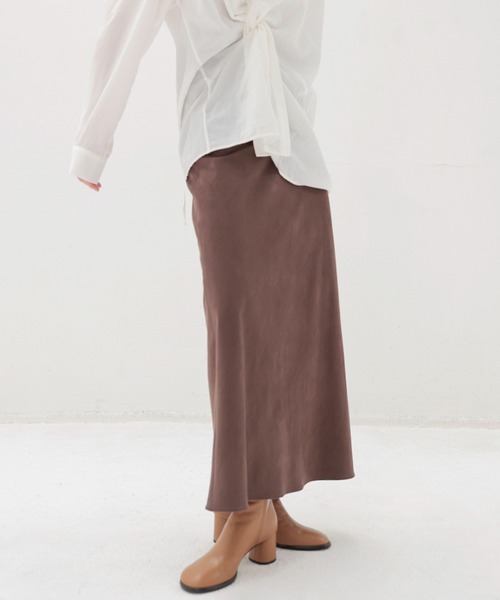 ■DESIGN マットなフェイクスエード素材を使用したセミフレアのフロアレングススカート。 一見シンプルなデザインながら、滑らかな質感と落ち感が、動くたびに美しいシルエットを表現。 ウエストにはゴムを内側に忍ばせ、見た目にはミニマルで洗練された印象に。 同素材のビスチェとのセットアップスタイルもおすすめで、柔らかなニュアンスをまとった女性らしい佇まいを演出します。 --------------------------- 透け感:なし 裏地:あり 伸縮性:なし ケア方法:手洗い可 ※お洗濯の際は洗濯表示を必ずご確認ください。 ---------------------------