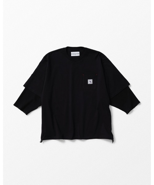 フェイクレイヤードのクルーネックカットソー。身頃、袖ともにゆったりとしたシルエットで、袖部分がレイヤードデザインとなっています。裾はドローコード入りでシルエット調整可能。左胸にワンポイントでネームが配置されています。ポケット口の赤いステッチがさりげないポイントとなっています。