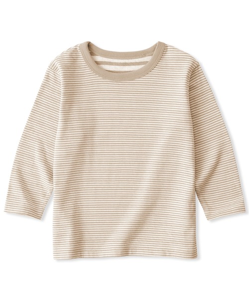 着替えやすい伸縮性の良い首周り。肌あたりが優しい縫い糸を使用。綿はオーガニックコットンです。2025年シーズンから”肌ごこち”がさらに良くなりました。【素材】やわらかな風合いが特長の接結編み素材を使用しています。綿100%で、表と裏の2枚の編地を繋ぎ合わせた、ふっくらとした程良い厚みが特長です。2枚構造で空気を含み、保温性があるので長い期間着ることができます。また、洗うとゆるやかなシワが出ることがありますが、生地特有の表情として味わうことができます。【デザイン】一枚でも重ね着もしやすいシルエットです。表裏で異なるボーダーピッチで、袖をまくると異なる柄配色が見える、遊び心のある一枚に仕上げています。大きな子どもの頭でもするっと着られる服育仕様で、肩のスナップを開閉する動作がなく、脱ぎ着が簡単です。【仕様】透け感:なし伸縮性:ありフィット感:普通お取扱い上のご注意 : ●濃色製品は使用中の摩擦や濡れた状態での接触により色移りする事があります。洗濯の際は他のものと分けて洗ってください。お取扱い上のご注意2 : ●素材の特性上、着用や洗濯・クリーニング時の摩擦により毛羽立ち、毛玉が発生します。その際はお早めに毛玉取り器などで手入れをしてください。お取扱い上のご注意3 : ●二重編のため、接結部分の糸が引けて見えることがあります。また、洗濯により生地表面に波打ちが生じますのでご了承ください。お洗濯上のご注意2 : ●淡色製品には蛍光増白剤入り洗剤を使用しないでください。お洗濯上のご注意3 : ●洗濯ネットをご使用ください。お洗濯上のご注意4 : ●アイロンはあて布を使用してください。