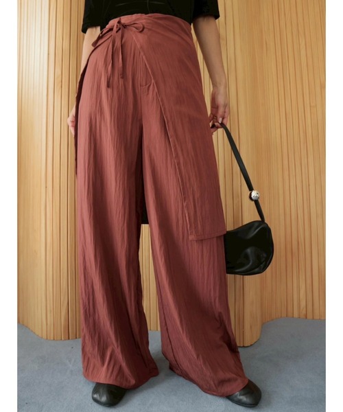 【Item Comment】ラップスカート付き2WAYストレートパンツ。共布の巻きスカートとセットでも別々でも着用OKで着回しの幅が広がります。ビンテージライクな生地を使用、程良い膨らみと光沢感が上品な印象に!やや光沢を抑えたマットな質感と、落ち感のある生地が美しいドレープを生み、シンプルながらも印象的なボトムに。しなやかなレーヨンにナイロンをブレンドした、落ち感と軽さが魅力の素材感。軽く薄手でまだまだ暑い晩夏~秋にぴったりの素材感です。パンツ:シンプルなスラックスデザインです。ストレートシルエットで綺麗めな印象で着用可能。ウエストゴムで快適に。巻きスカート:セットでの着用はもちろんのこと、デニムやリラックスパンツなどとの組み合わせもお勧めです。腰まわりを包むラップデザインが、気になる体型を自然にカバーしつつ抜け感のあるトレンドスタイルに仕上げてくれます。リゾートシーンにも、都会的なモードスタイルにもマッチする、バランスが絶妙なパンツです。【Coordinate】コンパクトなトップスを合わせてウエストを見せて着るのがおすすめタンクトップやリTシャツをインすればすっきりまとまります。ヒールを合わせればより洗練された印象に、フラットシューズで抜け感のあるデイリースタイルにも◎【Color Variation】BLACK/BROWN※着用画像は実際の商品とお色味が多少異なる場合がございます。【Material】裏地:□あり ■なし厚み:■薄手 □普通 □厚手透け感:□あり ■なし伸縮性:□あり ■なし光沢感:■ややあり □なし※手洗い可【Model】Director(佐野真依子):162cm【 “お気に入り登録”でお買いものが便利に! 】▼商品のお気に入り登録完売カラーの再入荷時や、ラスト1点の時、セール開始時にお知らせします。▼ブランドのお気に入り登録新商品や再入荷、セール情報など、いち早くTRUNC88のお得な情報を受け取ることができます。ぜひご活用ください。