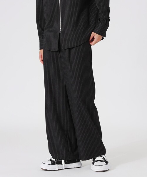 ボリューム感のある2タックバギーパンツ【素材】上品な光沢感があり肌触りが滑らかなクラシックなストライプ柄のポリエステル×レーヨン素材を使用。ポリエステルの軽さとレーヨンの通気性が組み合わさることで、軽やかな履き心地を得られます。ポリエステルを含んでいるため、丈夫でシワになりにくくイージーケアなのも嬉しいポイント。【シルエット/デザイン】膝から裾にかけて広がるバギーシルエット。ウエスト部分に入った2本のタックが、腰回りに程よいゆとりを生み出し、動きやすく快適な履き心地です。ストライプ柄が視線を縦に誘導することで、脚がスラッと長く見える効果があります。ウエストの後ろがゴム仕様になっているので、フィット感がありつつ着脱しやすくなっています。ドット釦やDカンといったシルバー付属使いもデザインポイントです。【スタイリング/その他】シャツと合わせたキレイめスタイルやスウェットやニットと合わせたカジュアルスタイルにもおすすめです。【お手入れ方法】こちらの商品は、ご家庭での洗濯が可能です。━━━━━━━━━━━━━━━━━━━━━━━━━━お買い物をお楽しみ頂くために<商品のお気に入り登録>完売カラーの再入荷通知など、お得な情報をお届けします。<注意事項>この商品はサンプルでの撮影を行っています。実際の商品とイメージが異なる場合がございます。撮影環境により、光の当たり具合で色味が違って見える場合があります。あらかじめご了承下さい。